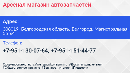 Арсенал, магазин автозапчастей по адресу 308019, Белгородская область, Белгород, Магистральная, 55 к4 в дальнейшем Организация, размещена в следующих категориях: