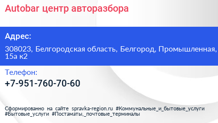 Autobar, центр авторазбора по адресу 308023, Белгородская область, Белгород, Промышленная, 15а к2 в дальнейшем Организация, размещена в следующих категориях: