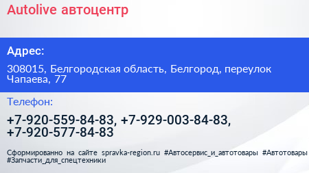 Autolive, автоцентр по адресу 308015, Белгородская область, Белгород, переулок Чапаева, 77 в дальнейшем Организация, размещена в следующих категориях: