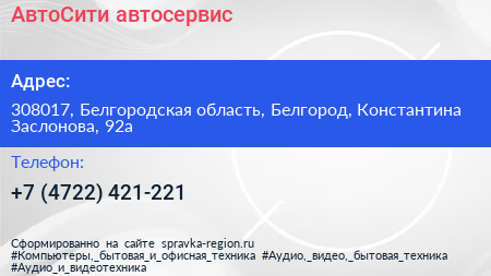 АвтоСити, автосервис по адресу 308017, Белгородская область, Белгород, Константина Заслонова, 92а в дальнейшем Организация, размещена в следующих категориях: