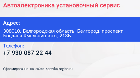 Автоэлектроника, установочный сервис по адресу 308010, Белгородская область, Белгород, проспект Богдана Хмельницкого, 213Б в дальнейшем Организация, размещена в следующих категориях: