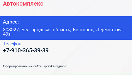 Автокомплекс по адресу 308027, Белгородская область, Белгород, Лермонтова, 49а в дальнейшем Организация, размещена в следующих категориях: