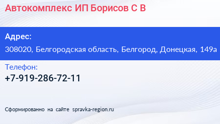 Автокомплекс, ИП Борисов С.В. по адресу 308020, Белгородская область, Белгород, Донецкая, 149а в дальнейшем Организация, размещена в следующих категориях: