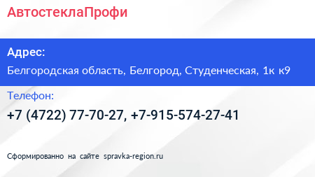 АвтостеклаПрофи по адресу Белгородская область, Белгород, Студенческая, 1к к9 в дальнейшем Организация, размещена в следующих категориях: