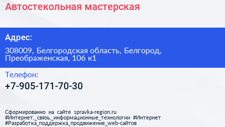 Автостекольная мастерская по адресу 308009, Белгородская область, Белгород, Преображенская, 106 к1 в дальнейшем Организация, размещена в следующих категориях: