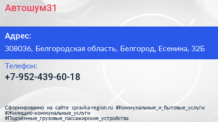 Автошум31 по адресу 308036, Белгородская область, Белгород, Есенина, 32Б в дальнейшем Организация, размещена в следующих категориях: