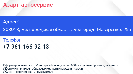 Азарт, автосервис по адресу 308013, Белгородская область, Белгород, Макаренко, 25а в дальнейшем Организация, размещена в следующих категориях:
