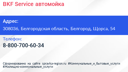 BKF Service, автомойка по адресу 308036, Белгородская область, Белгород, Щорса, 54 в дальнейшем Организация, размещена в следующих категориях: