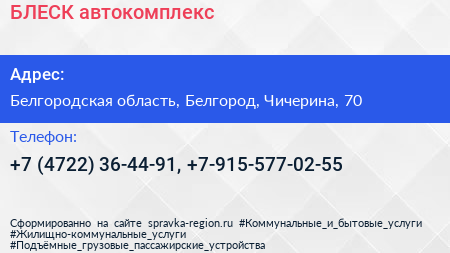 БЛЕСК, автокомплекс по адресу Белгородская область, Белгород, Чичерина, 70 в дальнейшем Организация, размещена в следующих категориях: