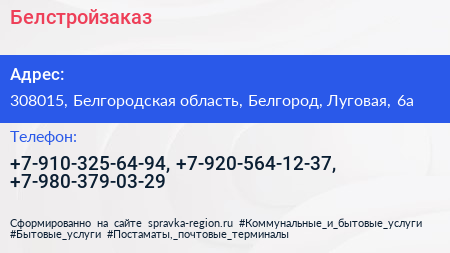 Белстройзаказ по адресу 308015, Белгородская область, Белгород, Луговая, 6а в дальнейшем Организация, размещена в следующих категориях: