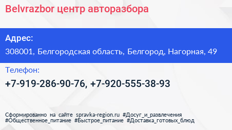 Belvrazbor, центр авторазбора по адресу 308001, Белгородская область, Белгород, Нагорная, 49 в дальнейшем Организация, размещена в следующих категориях: