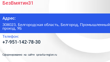 БезВмятин31 по адресу 308023, Белгородская область, Белгород, Промышленный проезд, 9Б в дальнейшем Организация, размещена в следующих категориях: