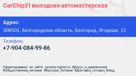 CarChip31, выездная автомастерская по адресу 308501, Белгородская область, Белгород, Ягодная, 15 в дальнейшем Организация, размещена в следующих категориях:
