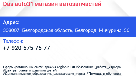 Das auto31, магазин автозапчастей по адресу 308007, Белгородская область, Белгород, Мичурина, 56 в дальнейшем Организация, размещена в следующих категориях:
