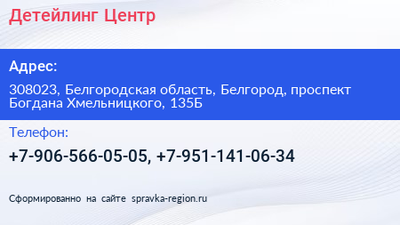 Детейлинг Центр по адресу 308023, Белгородская область, Белгород, проспект Богдана Хмельницкого, 135Б в дальнейшем Организация, размещена в следующих категориях: