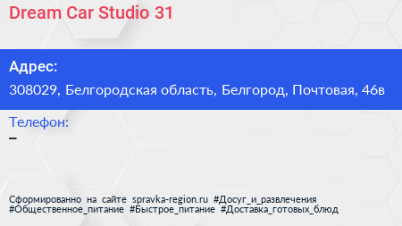 Dream Car Studio 31 по адресу 308029, Белгородская область, Белгород, Почтовая, 46в в дальнейшем Организация, размещена в следующих категориях: