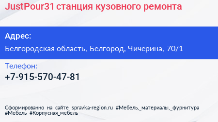 JustPour31, станция кузовного ремонта по адресу Белгородская область, Белгород, Чичерина, 70/1 в дальнейшем Организация, размещена в следующих категориях: