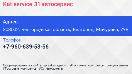 Kat-service 31, автосервис по адресу 308002, Белгородская область, Белгород, Мичурина, 79Б в дальнейшем Организация, размещена в следующих категориях: