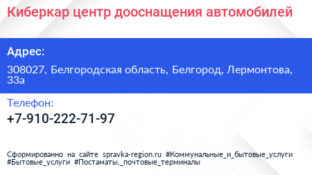 Киберкар, центр дооснащения автомобилей по адресу 308027, Белгородская область, Белгород, Лермонтова, 33а в дальнейшем Организация, размещена в следующих категориях: