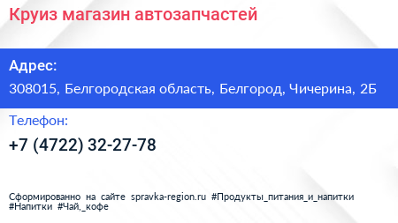 Круиз, магазин автозапчастей по адресу 308015, Белгородская область, Белгород, Чичерина, 2Б в дальнейшем Организация, размещена в следующих категориях: