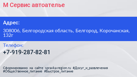 М-Сервис, автоателье по адресу 308006, Белгородская область, Белгород, Корочанская, 132г в дальнейшем Организация, размещена в следующих категориях: