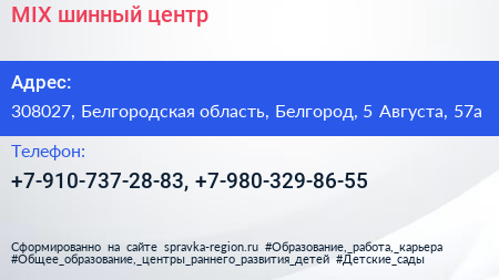 MIX, шинный центр по адресу 308027, Белгородская область, Белгород, 5 Августа, 57а в дальнейшем Организация, размещена в следующих категориях: