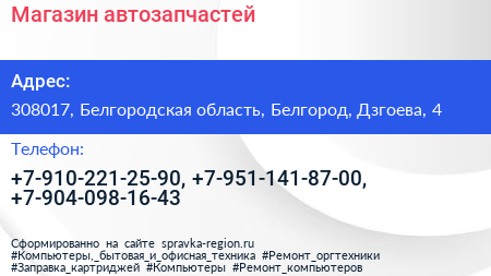 Магазин автозапчастей по адресу 308017, Белгородская область, Белгород, Дзгоева, 4 в дальнейшем Организация, размещена в следующих категориях: