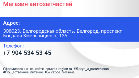 Магазин автозапчастей по адресу 308023, Белгородская область, Белгород, проспект Богдана Хмельницкого, 135 в дальнейшем Организация, размещена в следующих категориях: