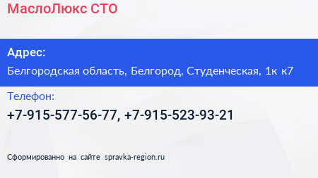 МаслоЛюкс, СТО по адресу Белгородская область, Белгород, Студенческая, 1к к7 в дальнейшем Организация, размещена в следующих категориях: