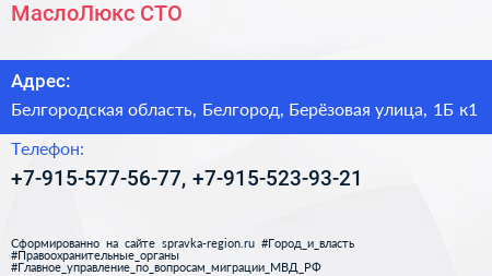 МаслоЛюкс, СТО по адресу Белгородская область, Белгород, Берёзовая улица, 1Б к1 в дальнейшем Организация, размещена в следующих категориях:
