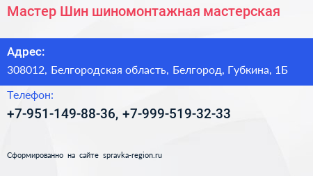 Мастер Шин, шиномонтажная мастерская по адресу 308012, Белгородская область, Белгород, Губкина, 1Б в дальнейшем Организация, размещена в следующих категориях: