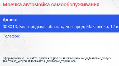 Моечка, автомойка самообслуживания по адресу 308013, Белгородская область, Белгород, Макаренко, 12 к5 в дальнейшем Организация, размещена в следующих категориях: