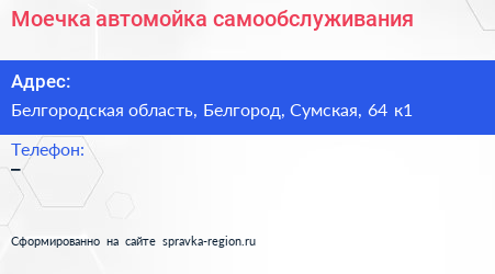 Моечка, автомойка самообслуживания по адресу Белгородская область, Белгород, Сумская, 64 к1 в дальнейшем Организация, размещена в следующих категориях: