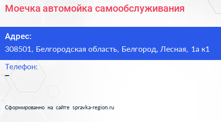Моечка, автомойка самообслуживания по адресу 308501, Белгородская область, Белгород, Лесная, 1а к1 в дальнейшем Организация, размещена в следующих категориях: