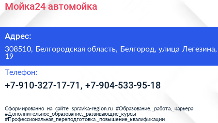 Мойка24, автомойка по адресу 308510, Белгородская область, Белгород, улица Легезина, 19 в дальнейшем Организация, размещена в следующих категориях: