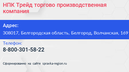 НПК Трейд, торгово-производственная компания по адресу 308017, Белгородская область, Белгород, Волчанская, 169 в дальнейшем Организация, размещена в следующих категориях: