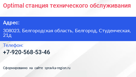 Optimal, станция технического обслуживания по адресу 308023, Белгородская область, Белгород, Студенческая, 21д в дальнейшем Организация, размещена в следующих категориях:
