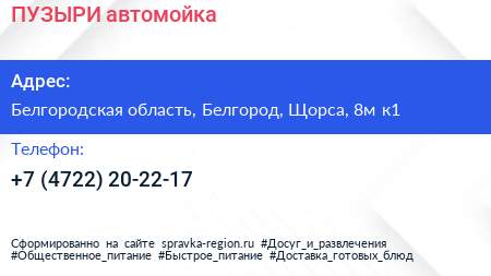 ПУЗЫРИ, автомойка по адресу Белгородская область, Белгород, Щорса, 8м к1 в дальнейшем Организация, размещена в следующих категориях: