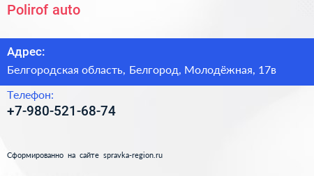 Polirof auto по адресу Белгородская область, Белгород, Молодёжная, 17в в дальнейшем Организация, размещена в следующих категориях: