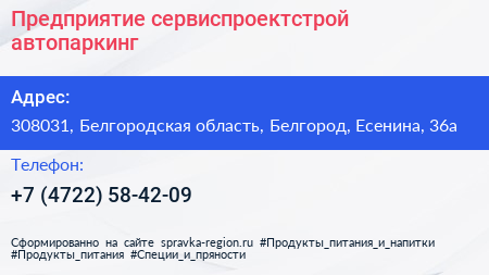 Предприятие сервиспроектстрой, автопаркинг по адресу 308031, Белгородская область, Белгород, Есенина, 36а в дальнейшем Организация, размещена в следующих категориях: