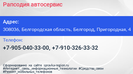 Рапсодия, автосервис по адресу 308036, Белгородская область, Белгород, Пригородная, 4 в дальнейшем Организация, размещена в следующих категориях: