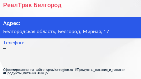 РеалТрак Белгород по адресу Белгородская область, Белгород, Мирная, 17 в дальнейшем Организация, размещена в следующих категориях: