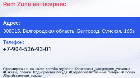 Rem Zona, автосервис по адресу 308015, Белгородская область, Белгород, Сумская, 165а в дальнейшем Организация, размещена в следующих категориях: