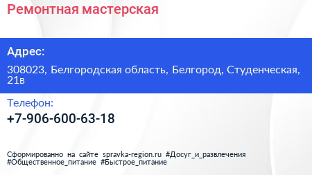 Ремонтная мастерская по адресу 308023, Белгородская область, Белгород, Студенческая, 21в в дальнейшем Организация, размещена в следующих категориях: