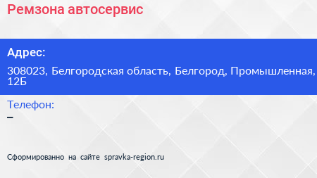 Ремзона, автосервис по адресу 308023, Белгородская область, Белгород, Промышленная, 12Б в дальнейшем Организация, размещена в следующих категориях: