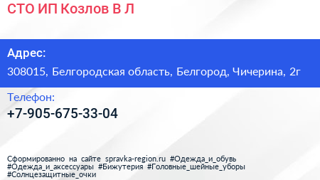 СТО, ИП Козлов В.Л. по адресу 308015, Белгородская область, Белгород, Чичерина, 2г в дальнейшем Организация, размещена в следующих категориях: