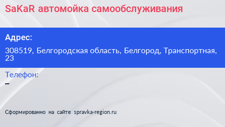 SaKaR, автомойка самообслуживания по адресу 308519, Белгородская область, Белгород, Транспортная, 23 в дальнейшем Организация, размещена в следующих категориях: