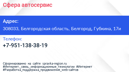 Сфера, автосервис по адресу 308033, Белгородская область, Белгород, Губкина, 17и в дальнейшем Организация, размещена в следующих категориях: