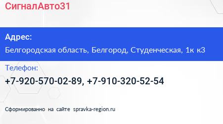 СигналАвто31 по адресу Белгородская область, Белгород, Студенческая, 1к к3 в дальнейшем Организация, размещена в следующих категориях: