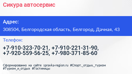 Сикура, автосервис по адресу 308504, Белгородская область, Белгород, Дачная, 43 в дальнейшем Организация, размещена в следующих категориях: